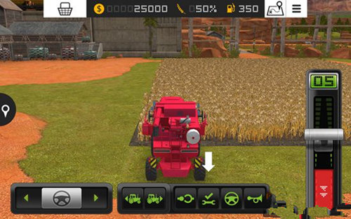 玩家需操控各类农用车辆作业。以收割机为例:将屏幕右侧推杆向上推,车辆即向前行驶;将推杆向下推至红色区域,车辆即向后倒退。