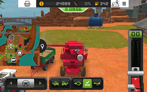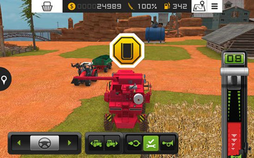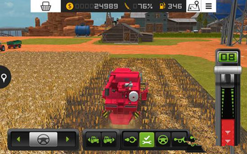 屏幕上方实时显示车辆剩余油量及麦仓装载状态。当麦仓装满后,玩家需将收割的麦子倾倒转移至拖拉机中。