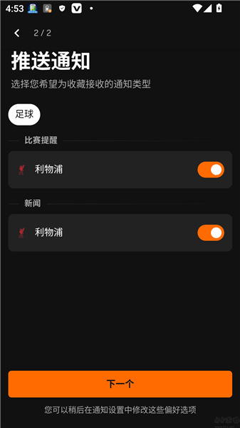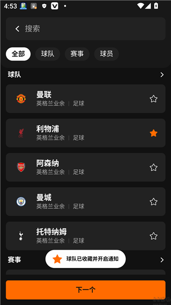1、选择对应关注的球队后点击下一步