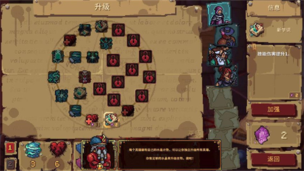 5、通关后会回到休整区域时点击贴着英雄头像的木板就可以对对应角色进行强化升级,每名英雄都有独立的水晶资源但升级时需要合理分配。