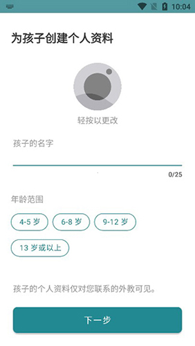 1、接下来要为孩子创建档案,输入名字下一步。