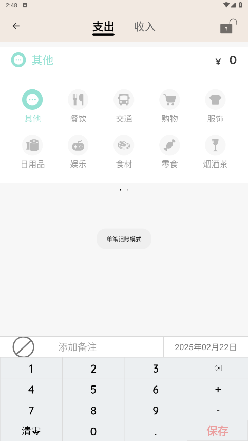 2、选择类型并备注,记账更便捷