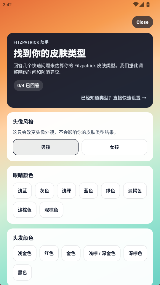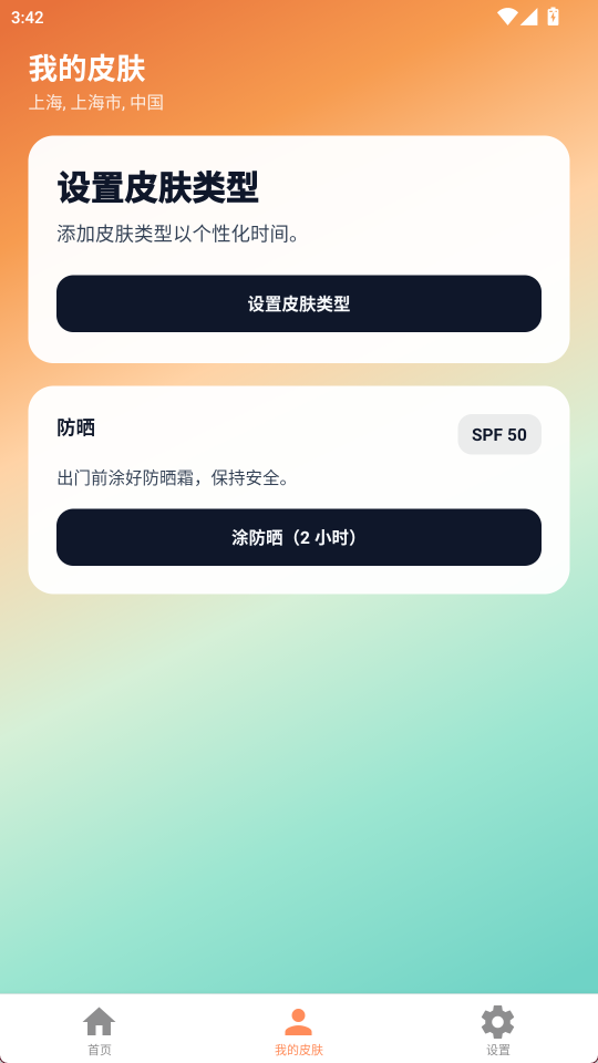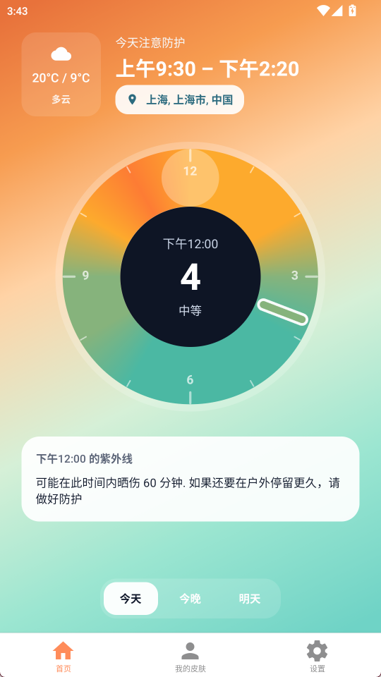 3、 肤质评估:内置多种皮肤类型选项,用户选择后系统自动计算在不涂防晒下的安全停留时间。
