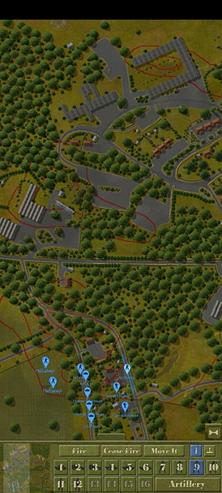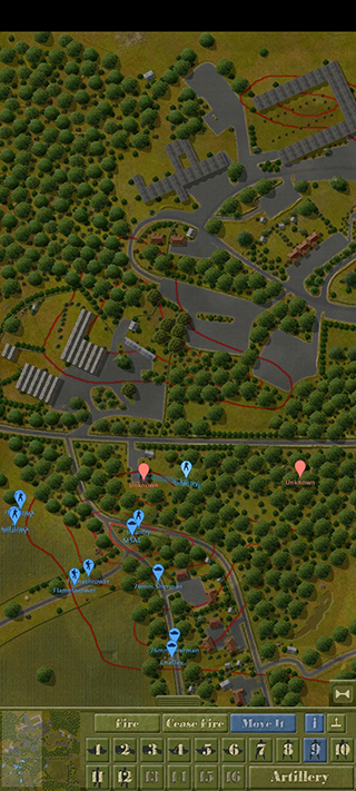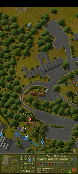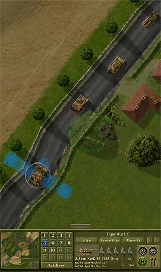 如图所示,我方的后续部队被敌方察觉,但由于丛林的复杂环境,敌人未能成功对我方进行交叉火力压制。在这种情况下,决定让部队继续推进,并派遣M5A1坦克进行支援。地图最左端的机械步兵则展开穿插战术,利用周围遮蔽物的掩护,避免遭受敌方火力打击。