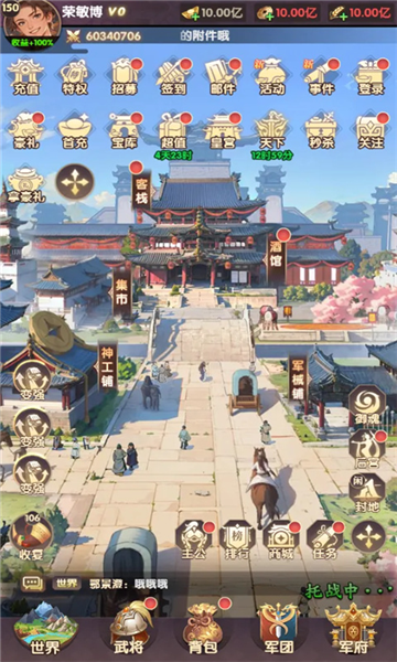 在城池中可进行酒馆招募、客栈宴请、集市购买道具、购买资源及参与战役活动。在世界地图中可进行关卡挑战,参与城战,拜访武将。