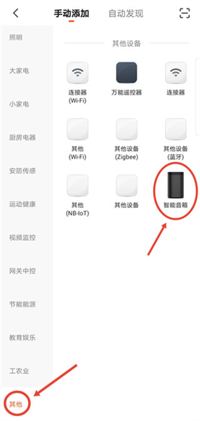 1、添加音箱设备,有两种方式,手动添加和自动发现,以手动连接为例,点击智能音箱