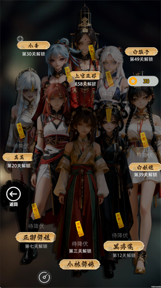 展示了所有可收服的女妖角色,每个女妖对应不同的关卡解锁条件,通关对应关卡即可解锁并尝试降伏该女妖。