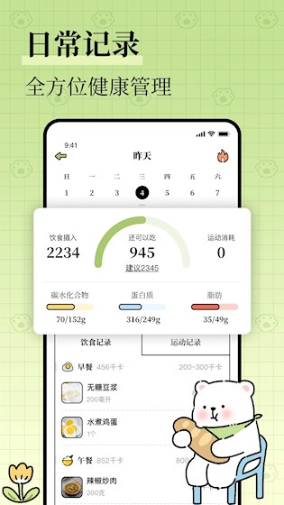 2、 热量精准追踪:内置丰富食物库,支持手动输入或拍照识别方式录入餐食,实时计算每餐热量与营养构成,形成清晰摄入曲线。