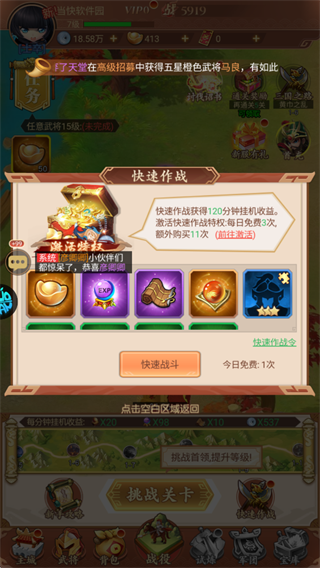 4、挂机放置玩法:支持离线挂机功能,即使玩家不在线,也能自动积累经验值与各类游戏资源,无需花费大量时间手动操作,让游戏进度永不落后,轻松享受三国游戏的乐趣,适配碎片化时间。