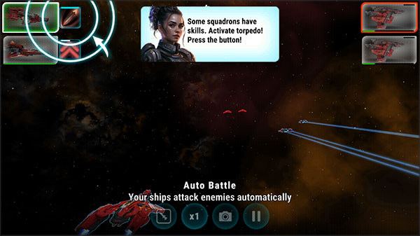 2、进入之后,点击飞船图标可以进行切换飞船,点击旁边的图标进行攻击。