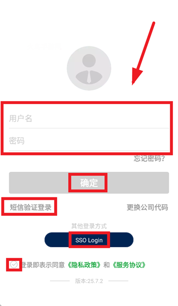 输入用户名,密码,勾选登录即表示同意 《隐私政策》 》和 会 《服务协议》,点击确定即可,还可以使用短信验证登录及SSO Login方式登录
