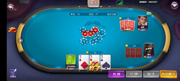 1、每位玩家将获得三张底牌,通过亮牌、跟注、加注或弃牌等操作展开对决。上局获胜者拥有优先行动权,其余玩家依次响应,直至最终胜负揭晓。