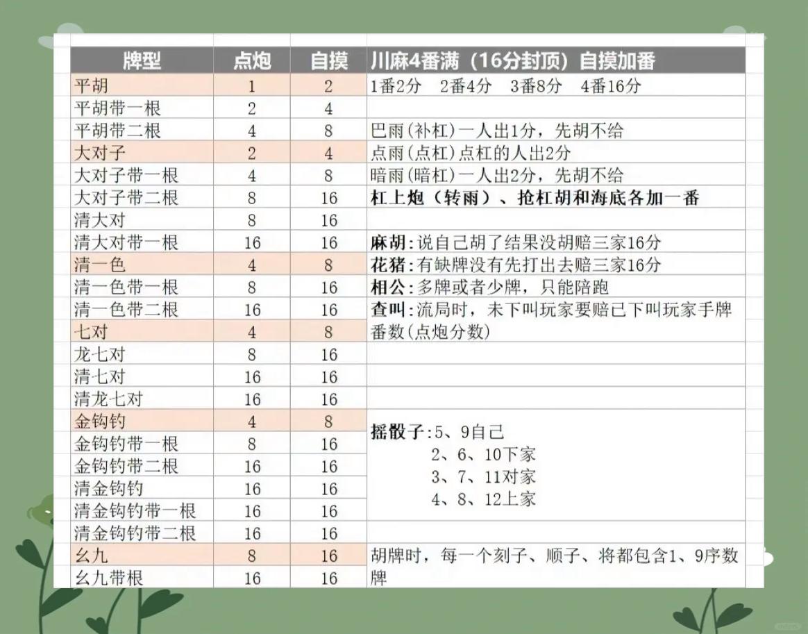 掌握基本番型计算是提升胜率的关键。四川麻将的计番规则通常以“2的n次方”来算分: