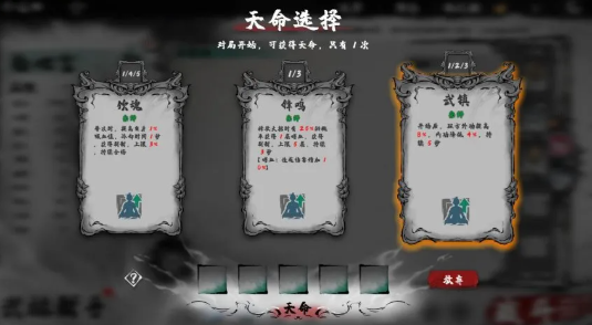 新增的“天命”骰子系统,核心解决了重复单局容易腻与策略空间不足的问题。可以将“天命”理解为单局生效的额外被动技能,最多可以装备5个。天命可以通过合成装备、购买宝具等途径获得,而激活方式则是通过投掷骰子获得对应点数,将骰子拖拽至天命卡上即可生效。