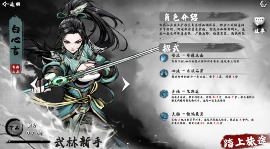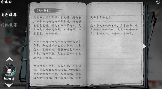 本次测试中,游戏为人物新增了丰富的剧情文本内容,通过门派故事与角色个人故事深化武侠氛围。比如白心言的身世就非常具有戏剧张力,她是屠村惨案的唯一幸存者,被人带回山庄抚养,这段“从孤女到侠客”的经历,不仅让角色形象更立体,又精准传递了武侠爱恨恩仇的意境,让不同需求的玩家都能快速代入到“武林大会”的设定中。