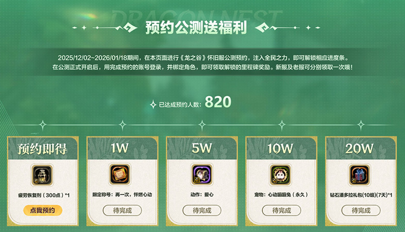 即日起,参与《龙之谷》怀旧服公测预约即可解锁里程碑奖励,“再一次,怦燃心动”活动专属称号、动作“爱心”、宠物心动蹦蹦兔(永久)等你来抱走,达成20万预约更可在公测开启后领取钻石潘多拉礼包(10组)!邀请好友预约怀旧公测,还有福利加码。更更更特别的是,邀好友活动还有神秘豪礼即将开启,敬请期待哦!