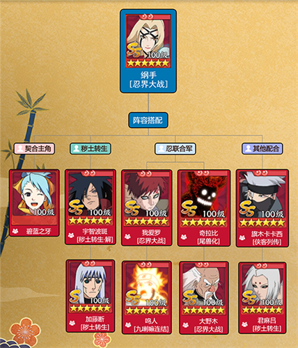 1、结合纲手[忍界大战]的技能特点,一图流搭配推荐: