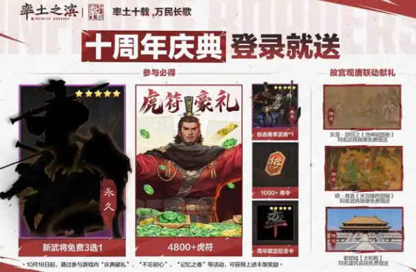 除了故宫观唐联动版本的限定福利。“庆典献礼”、“不忘初心”、“记忆之卷”等十周年限定活动将于10月18日开启,新武将免费3选1,免费领4800虎符,1000+将令。丰厚好礼,等你来拿!