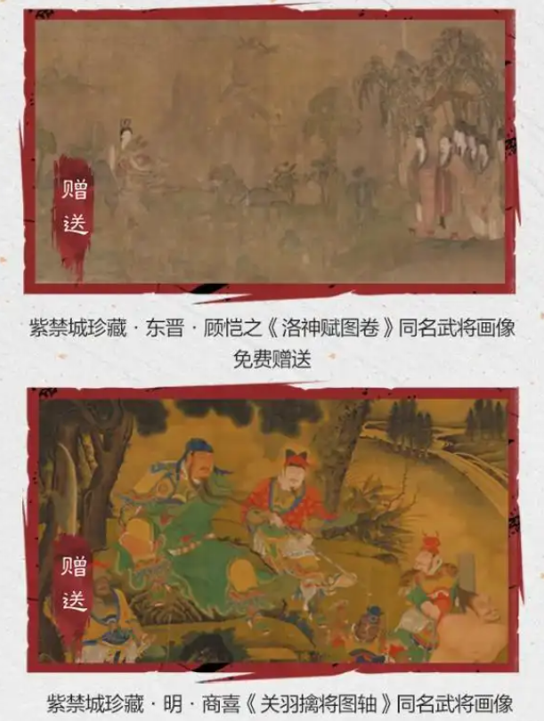 首先是联动中备受瞩目的 “紫禁城珍藏”系列武将画像!《洛神赋图》化作甄洛衣袂流光,《关羽擒将图》凝为关羽刀光。而且,这些同名武将画像都是免!费!送!