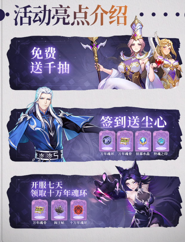 ·签到第2天即得SSR尘心,签到7天可得万年魂环、万年魂骨等豪华奖励;