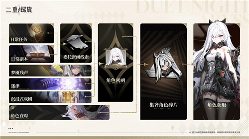 这里可以拆解为两部分理解,一是重构了玩家体验,让玩家从“赌博心流”过渡到“规划心流”。传统二游依赖抽卡随机性制造短期刺激,形成“充值-抽卡-爆金币”的赌博心流。而《二重螺旋》的“委托密函”系统,通过定向刷取、碎片合成、永久有效的设定,构建了一套全新的“规划心流”体验。