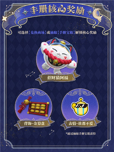 “织梦寻星季”派对季的派对手册分为基础版和高级版两部分,相应的奖励各不相同。本季基础派对手册的全部奖励有:800潮流纤维、17500瓶盖、稀有表情“强烈支持”、高级头像框“时光阁楼头像框”、稀有配饰“失落古币”、高级装扮“历史学者套装”。