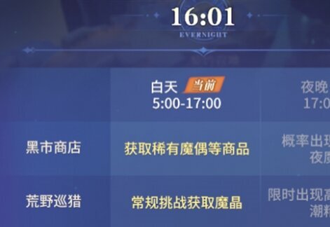 游戏最有趣的地方正是围绕着“永夜降临”这一设定,即每日下午的5点游戏中会产生变化,黑市商店会有概率出现噬夜之瞳夜魔魂枢,并且荒野寻猎会限时出现高难敌人,幸许会大为不同哦!