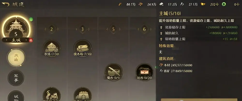 开荒期仅升级主线任务要求的建筑,切勿额外升级仓库、兵营等无关建筑。主城5级前过度升级非核心建筑,会消耗大量石料和木材,导致主城升级进度落后,解锁内政官、军事府等关键功能延迟。
