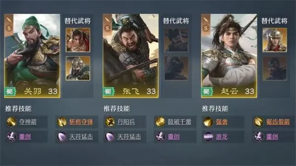 2. 微氪五虎队(赵云+张飞+关羽):赵云首充获取后当主C,张飞控场技能点到4级即可,关羽作为副C补充输出,开荒时优先保证赵云的技能等级(比队友高2级)。