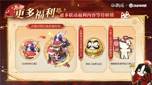 山兔彩蛋时装、小纸人跑跑狼彩蛋时装同步来袭,开启宝箱即有机会获得,还有趣味达摩萌宠盲盒上线,给你带来福运降临,更多联动福利内容前往游戏中即可查看