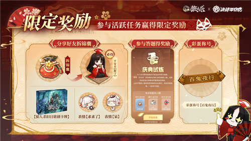 全民拆锦囊活动开启,活动期间前往游戏中拆锦囊,即可获得联动彩蛋时装、表情、点券等海量奖励,更有限定网易狼人杀卡牌周边等你来拿!阅读联动剧情故事,参与庆典试炼答题活动可获得吉愿达摩、小纸人跑跑狼宝箱等惊喜好礼。