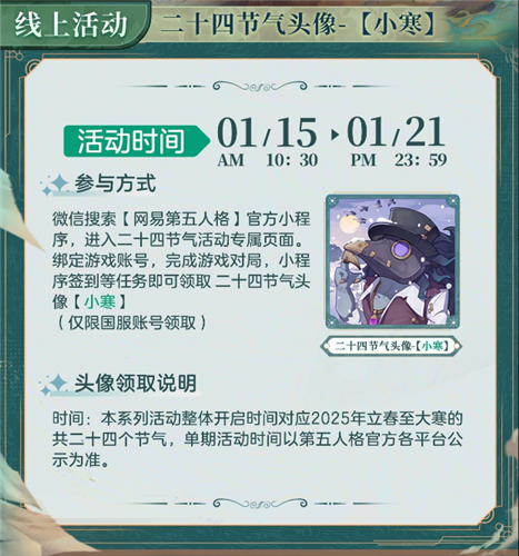 小寒节气线上活动将于1月15日10点30分-1月21日23点59分在【网易第五人格】官方小程序二十四节气活动专属页面开展,访客们在完成相应活动任务后即可领取二十四节气头像【小寒】(仅限国服账号领取)。画面中,“噩梦”抬头望着空中列队飞过的鸟群,雪花飘洒,银辉之下的景致别有一番风味。
