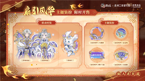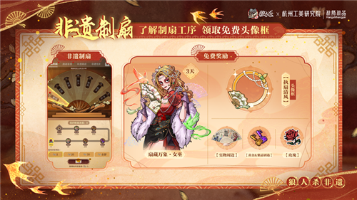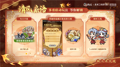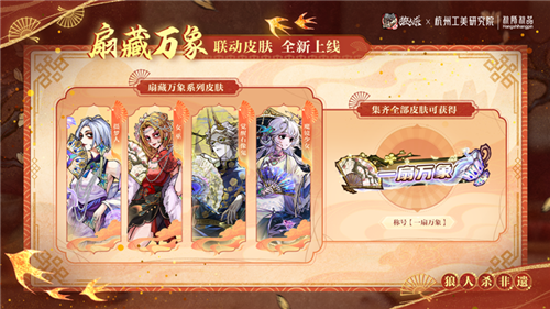《狼人杀》携手杭州工艺美术研究院开启非遗扇艺联动,全新联动板子“风声谍影”限时上线,看双觉醒石像鬼如何破局;扇藏万象系列联动皮肤全新上线,摄梦人、女巫、觉醒石像鬼、魔镜少女手执折扇,邀你领略非遗之美;游戏中参与非遗制扇活动,还可领取限定头像框;扇引风华主题联动时装及装扮来袭,更多庆典福利等你来解锁!