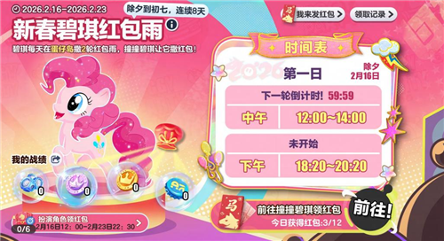 春节当然少不了满满福利!2月16日(大年三十)-2月23日(初七)每天中午12:00-14:00,下午18:20-20:20,派对主理人碧琪将在蛋仔岛开启彩虹币狂欢。领取碧琪的红包,单个红包至多可得66枚彩虹币!