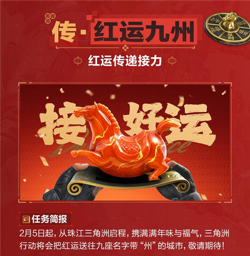 红运不止珠江三角洲,美好奔赴九州。2月5日起,《三角洲行动》将从珠江三角洲出发,携满满年味与福气,将新春红运送往九座名字带“州”的城市,敬请期待!