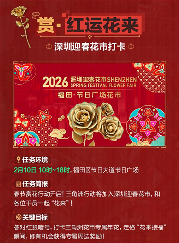 新春花市,红运花来。2月10日10:00-18:00,深圳迎春花市赏花行动开启,打卡三角洲花市专属年花,答对红狼暗号,定格“花来接福”瞬间,即有机会领取游戏专属周边奖励。