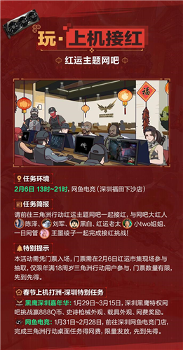 2月6日,深圳全城活动正式开启,多重特色活动轮番上线,干员们可以一起逛红运市集、赏灯光秀、玩主题网吧、品联动美食等!