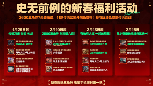 新春来洲接着红!《三角洲行动》新春福利活动即将全面开启,2600限时三角券7天登录送、最多11款传说武器外观免费送、传说近战武器参与玩法免费拿、更有六套福袋、新春大红、百万哈夫币红包等海量物资放送!邀全体干员共赴新春之约,一起红红火火过新年!