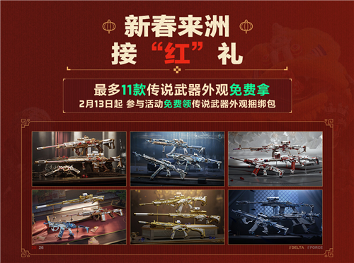 新春来洲接“红”礼!2月13日起,参与活动可领8款传说武器外观,2月16日起,参与活动可额外领取3款传说武器外观,最多可拿11款传说武器外观!