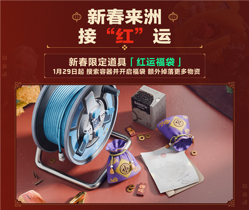 新春来洲接“红”运!1月29日起,在零号大坝、长弓溪谷地图内搜索容器,有概率获得新春限定道具【红运福袋】,开启福袋可额外掉落更多物资!2月13日起,全新烟花活动上线!在局内燃放烟花后,有概率掉落新春红包、新年大红及非洲之心!2月16日起,【新年快乐】语音返场发放,登陆游戏即可领取!