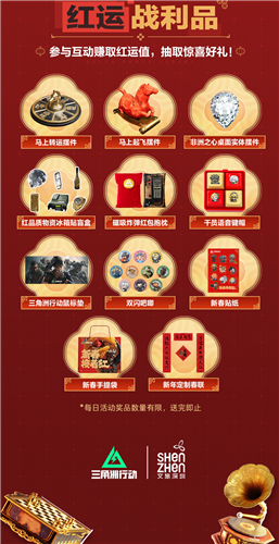 新春打卡赢好礼,专属周边等你拿!2月5日-2月12日,参与以上任意一项线下新春活动,拍摄打卡图片或视频,带双话题#三角洲深圳红运市集、#三角洲行动,发布至抖音、bilibili、快手、微信视频号、小红书、新浪微博任一平台,即可参与新春特别任务。3月1日,官方将在上述平台各抽取3位参与任务的幸运干员,送出《三角洲行动》官方周边大礼包一份。